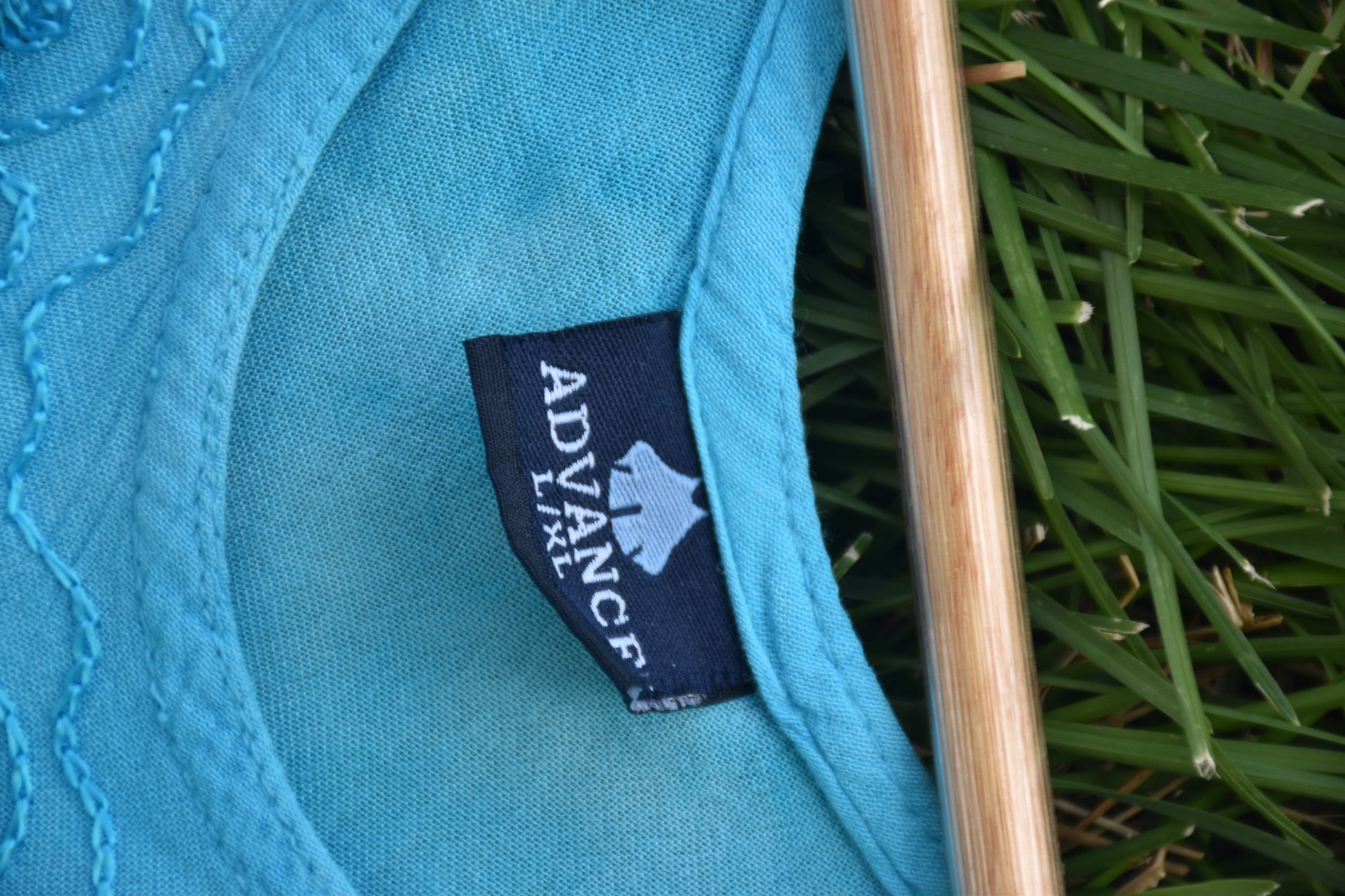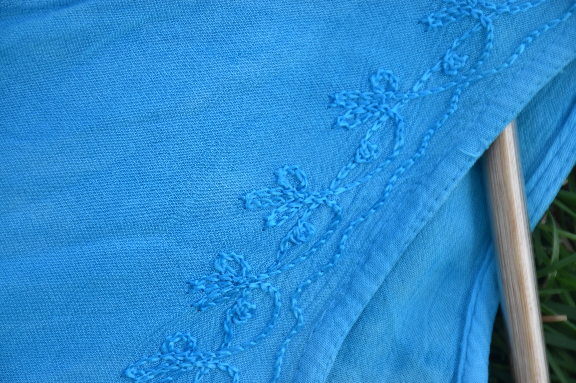 Flowy blue and white sleeveless tie dye dress with neckline embroidery. Size L/XL, 100% rayon.