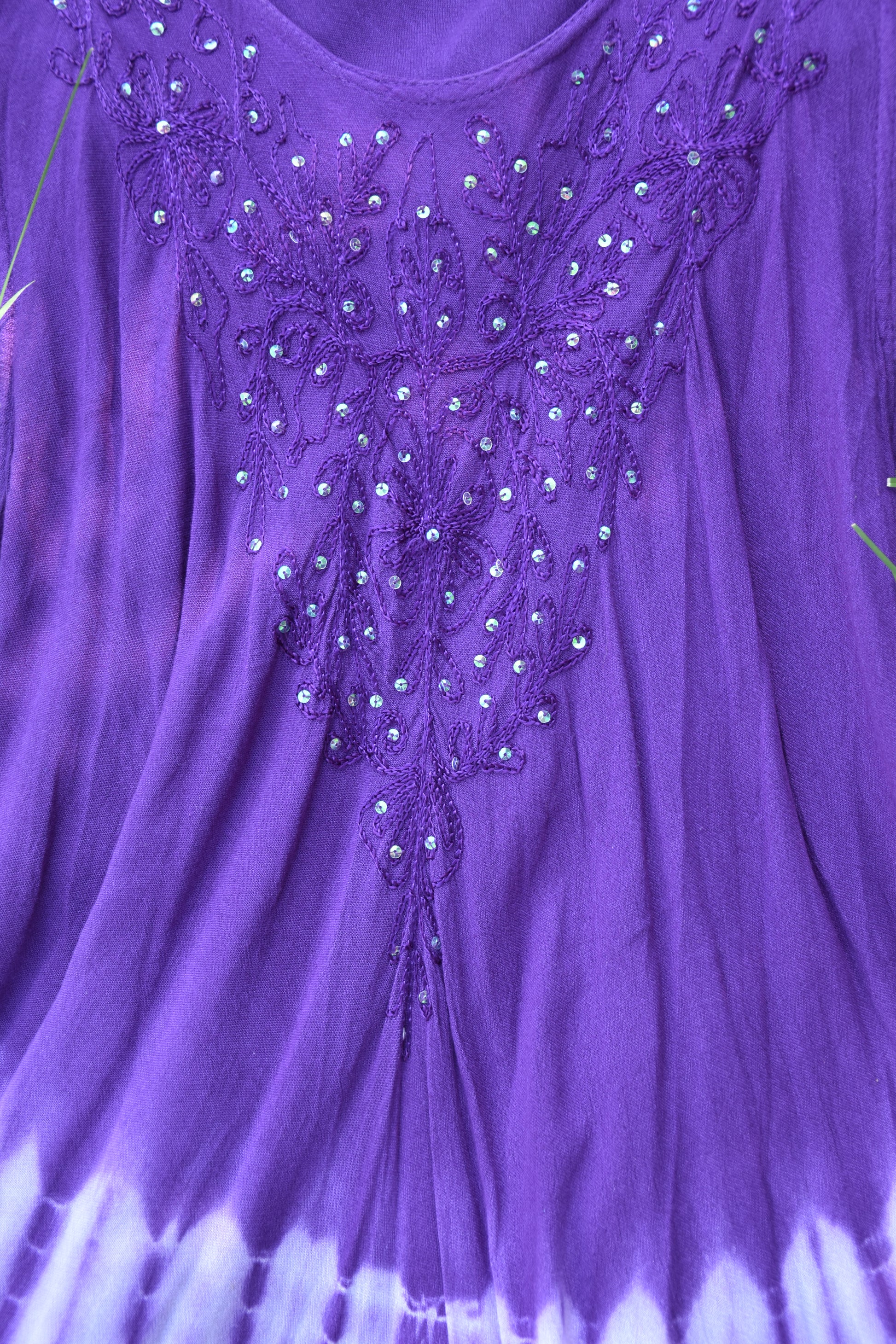 Flowy purple and orange "free size" tie dye dress. Sleeveless with embroidery and sequins on chest and around skirt. 65% cotton, 35% rayon.